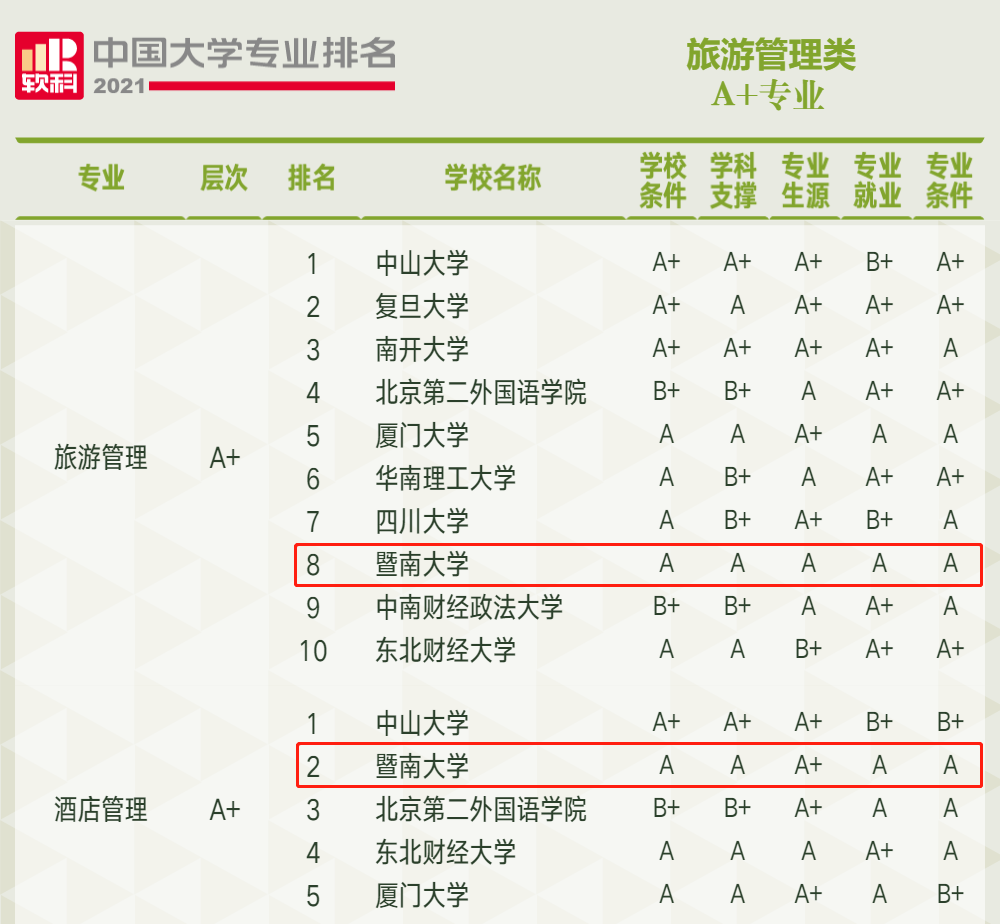 2020和2021年,在高等教育评价机构软科发布的“软科世界一流学科排名”中,成人a片 “旅游休闲管理”学科连续两年跻身全国前6,全球第51-100名。在“2021软科中国大学专业排名”中,成人a片 旅游管理专业和酒店管理专业喜获双A+,且在内地仅有的5家双A+高校中唯一获得细目类全A。
